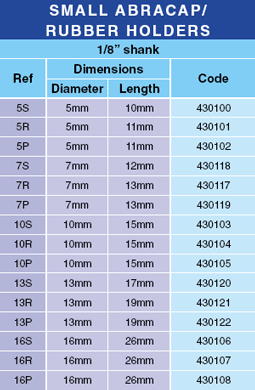 K???k AbraCap Tak?m Tip A’ya dahil AbraCap Z?mpara Kepleri ve esnek kau?uk tutucular t?m metallerin ince z?mparalama i?leri i?in yeni gere?lerdir. Kat? z?mparalaman?n yetersiz oldu?u hallerde AbraCap bu g?revi yerine getirir. Z?mpara Kepleri diki?siz imal edilir ve birka? z?mpara tabakas?ndan olu?ur. En son partik?le kadar kullan?labilir. AbraCap Tip A kaba ve ince kepler i?erir. ?? k?sm?nda zamkl? bir y?zeyi olan kepin kau?uk tutucuya iyice yap??mas? i?in z?mpara kepi ?zerinde itmeden ?nce kau?uk tutucunun y?zeyinin hafif?e ?slat?lmas? tavsiye edilir. Esnek kau?uk tutucularda boylamas?na bir yar?k vard?r. B?ylece kepi iterken hava d??ar? ka?ar ve kullan?lm?? kep bir b??akla yar?l?p kau?uk tutucudan ??kar?labilir. Kau?uk tutucunun ve itme keplerinin her biri be? de?i?ik ?apta ?? farkl? ?ekli vard?r. Kau?uk tutucular?n milleri 1/8” tir ve ?elikten yap?lm??t?r, ve kau?u?a sa?lam bir ?ekilde tutturulmu?tur. K???k ?aplar i?in tavsiye edilen d?n?? h?z? 6000-10000 rpm, b?y?k ?aplar i?in 3000-6000 rpm dir.